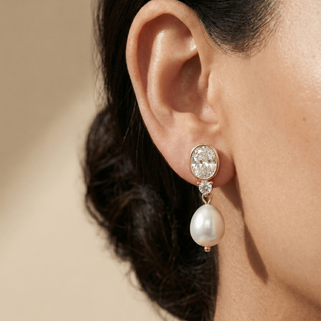 These Muse Pearl Drops feature genuine freshwater pearls, making them an elegant choice for special occasions. Each earring showcases a large bezel-set crystal paired with a delicate teardrop pearl, combining timeless beauty with a touch of sparkle to complement your special day perfectly.