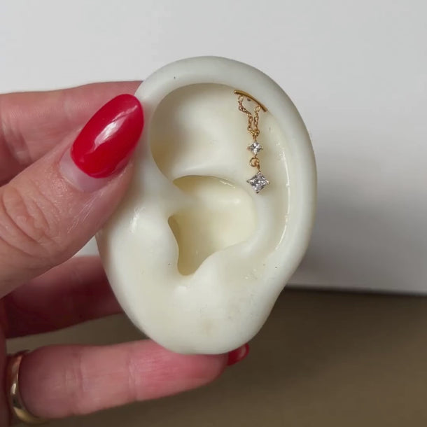 For the true stack connoisseurs. This hidden helix features a curved bar that hugs the ear just right, finished with two square-cut crystals suspended from a delicate gold chain.