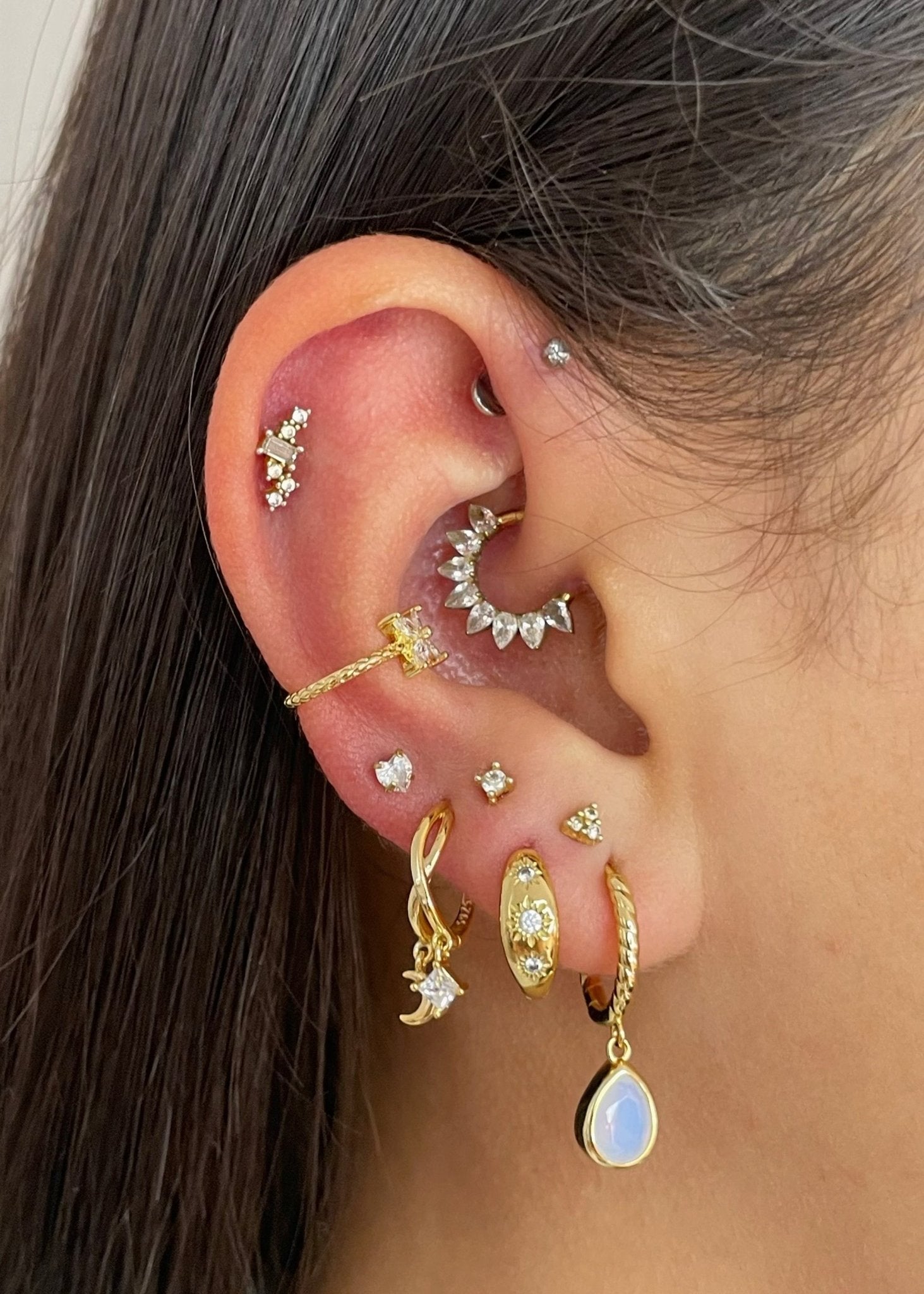 These twisted gold huggies are a fresh take on a classic. Designed for daily wear, the rope-textured hoop gives just enough detail to feel intentional, while the teardrop moonstone charm adds a soft, glowy finish. Lightweight, easy to stack, and subtle enough for 9–9 styling, they’re the kind of hoops you’ll forget you’re wearing – until someone compliments them.