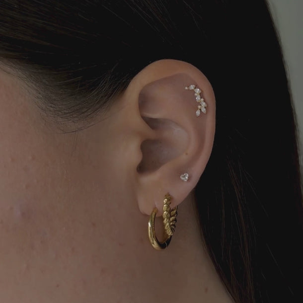 This curved cluster stud is made from implant-grade titanium – meaning it’s waterproof, irritation-free, and safe to leave in 24/7. Designed to hug the curve of your ear, the fan-like spread of marquise and round-cut crystals catches the light from every angle.