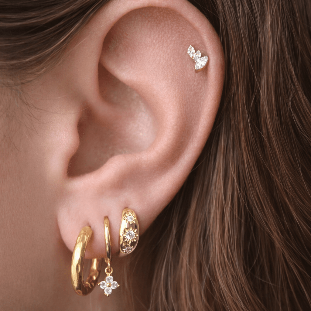 Our Winged Crystal Stud features a delicate trio of marquise-cut crystals, designed to mimic the effortless flutter of wings. Crafted in solid titanium, it's waterproof, hypoallergenic, and built for 24/7 wear - ready to sparkle through beach days, late nights, and everything in between.