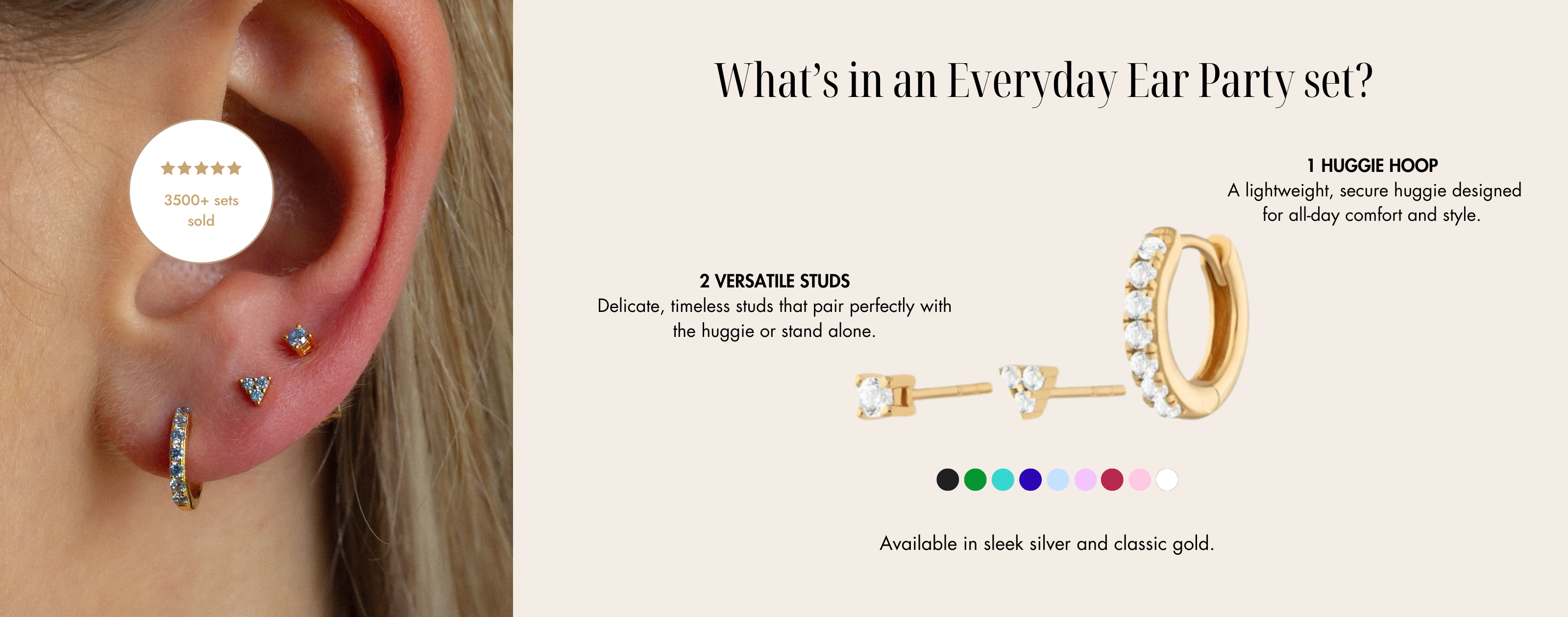 Each set includes 3 earrings (1 huggie and 2 studs), perfect for creating a unique ear stack. If you’d like to style both ears or add extra variety, you can purchase two sets for just £45!