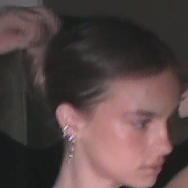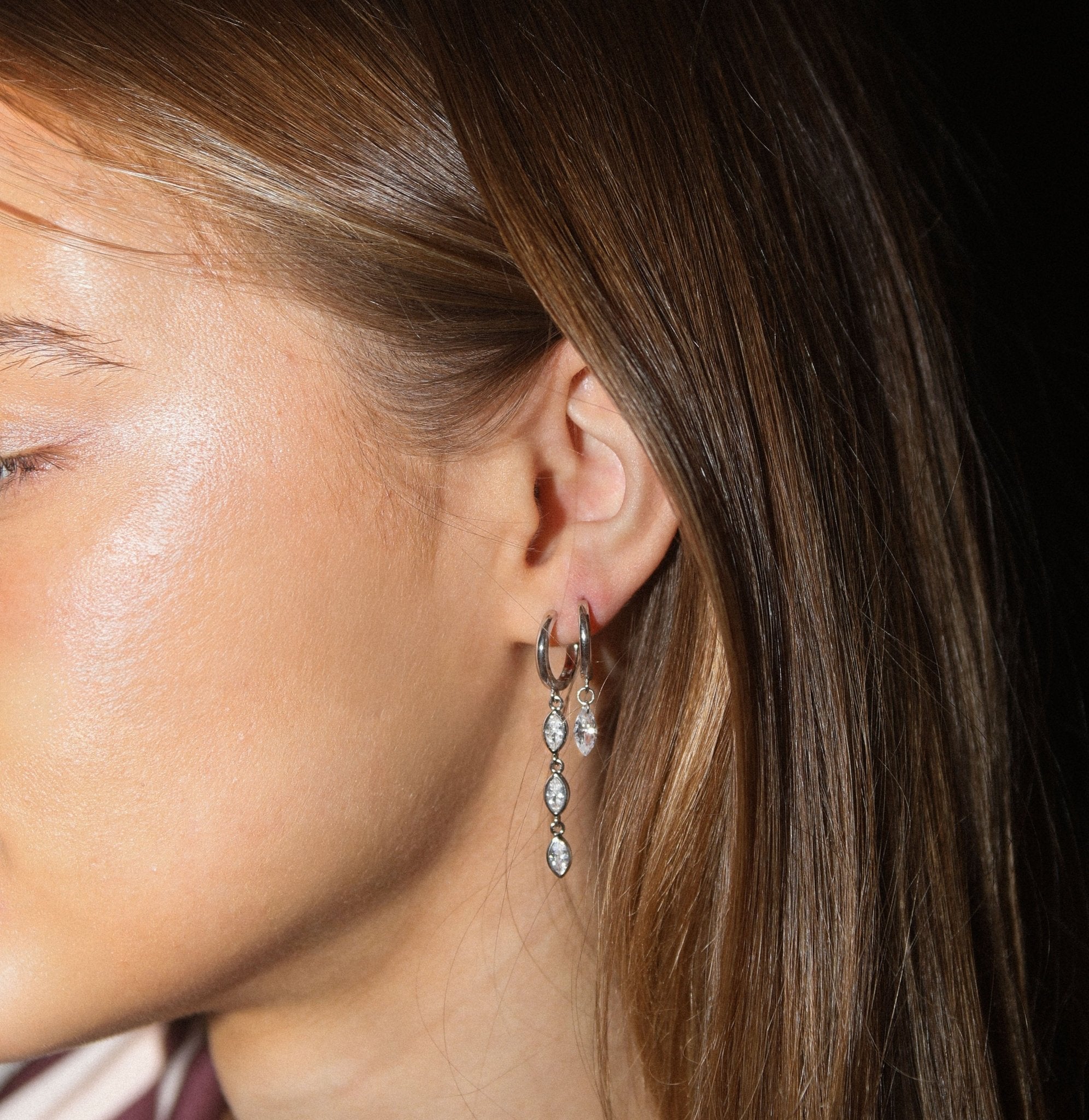 A pair of huggies with a long marquise chain designed to move and catch the light. Ideal for evenings and elevated styling.