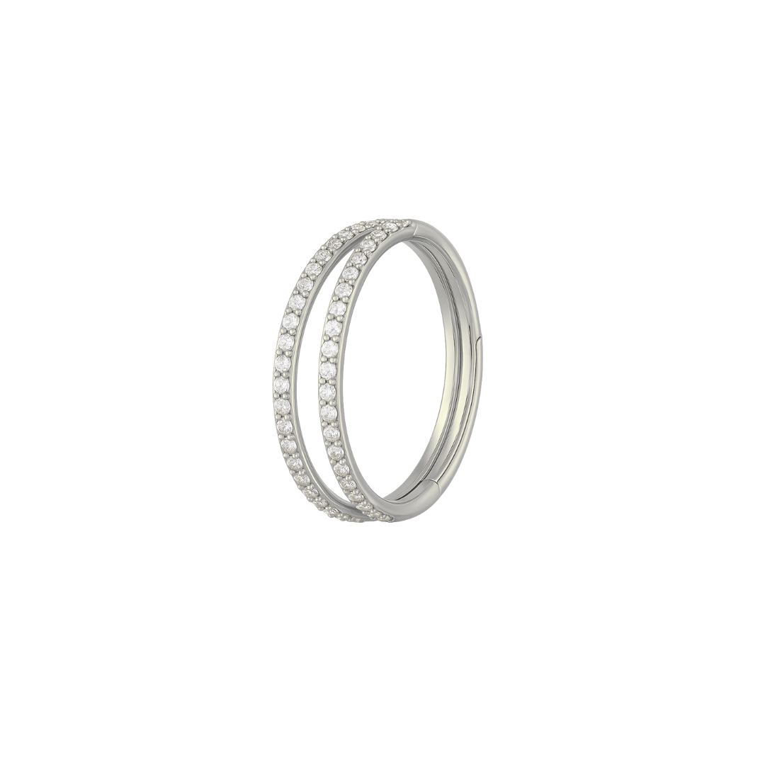 Two rows of brilliance, one effortless click. This Implantium™ clicker is crafted from medical-grade titanium featuring twin bands of pavé-set crystals that shimmer with every turn of your head. Hypoallergenic, waterproof, and endlessly durable - made for stacking, sleeping, and shining without limits.