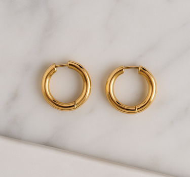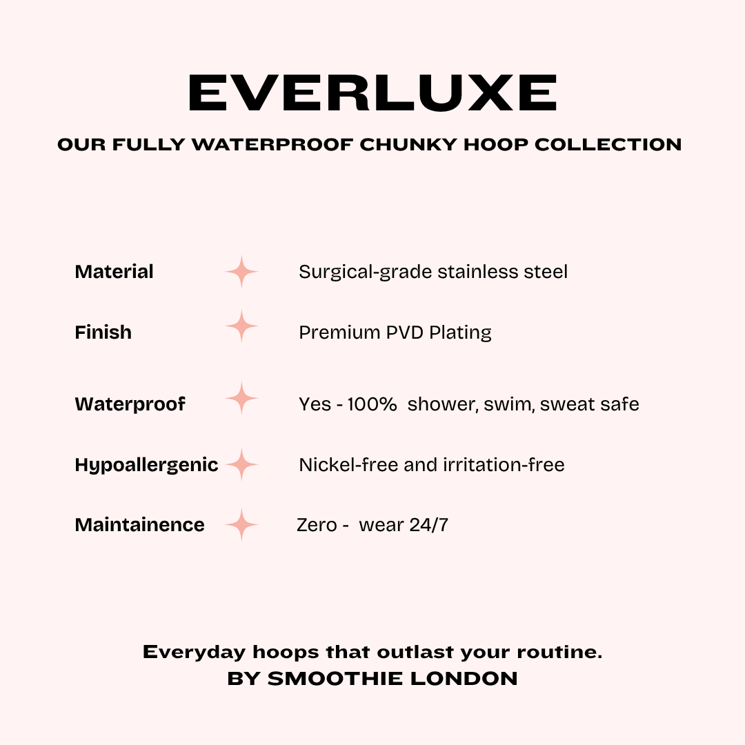 The Frankie Everluxe Hoops offer a perfect balance of chunky style with wearable comfort. Featuring a subtle drop shape, these waterproof earrings are designed to complement any look effortlessly.