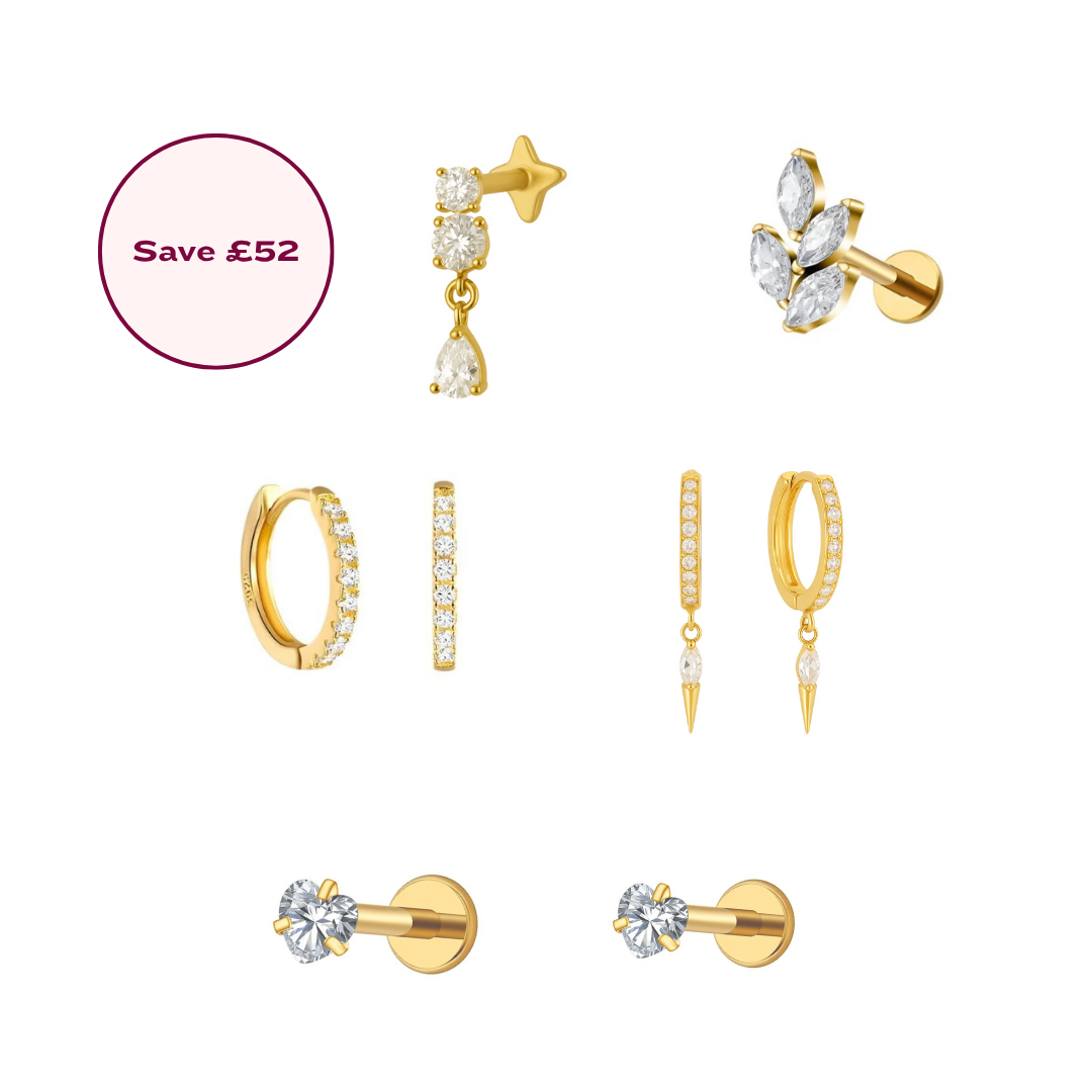 The Molly Mae Bundle features a timeless collection of eight exquisite earrings combining titanium flatbacks with sterling silver huggies. This elegant set offers versatility and durability, perfect for adding a touch of luxury to your everyday look or special occasions.