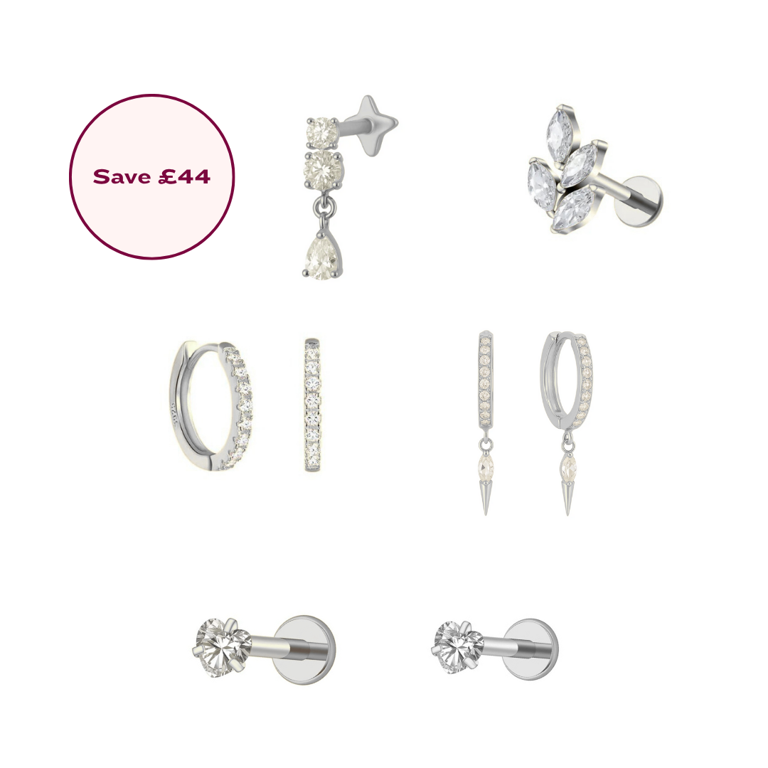 The Molly Mae Bundle features a timeless collection of eight exquisite earrings combining titanium flatbacks with sterling silver huggies. This elegant set offers versatility and durability, perfect for adding a touch of luxury to your everyday look or special occasions.