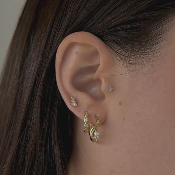 This curated edit pairs sculptural huggies, geometric sparkle, and delicate marquise studs to create contrast, shape and flow across your stack. Each piece stands alone - together, they feel intentional.