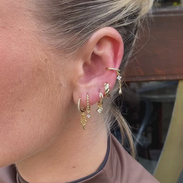 These Venus huggies in gold feature delicate textured bobbles and a small sparkling charm, adding a subtle touch of shine. Perfect for layering in an ear stack, they bring effortless elegance and charm to your everyday look.
